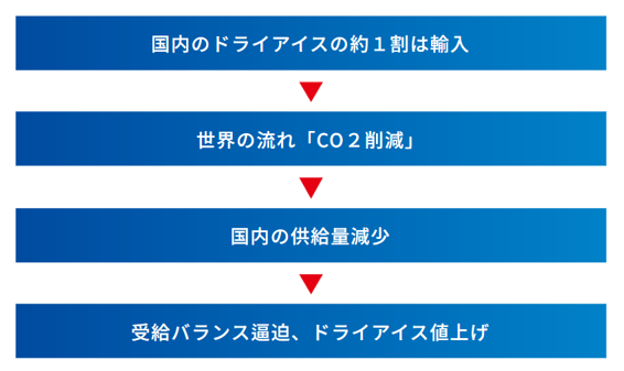 しかしその海外もCO2削減の世界的な流れのある中で、ドライアイスの供給量は減少することが予想されます。その結果、需給バランスはひっ迫し、値上げは免れません。